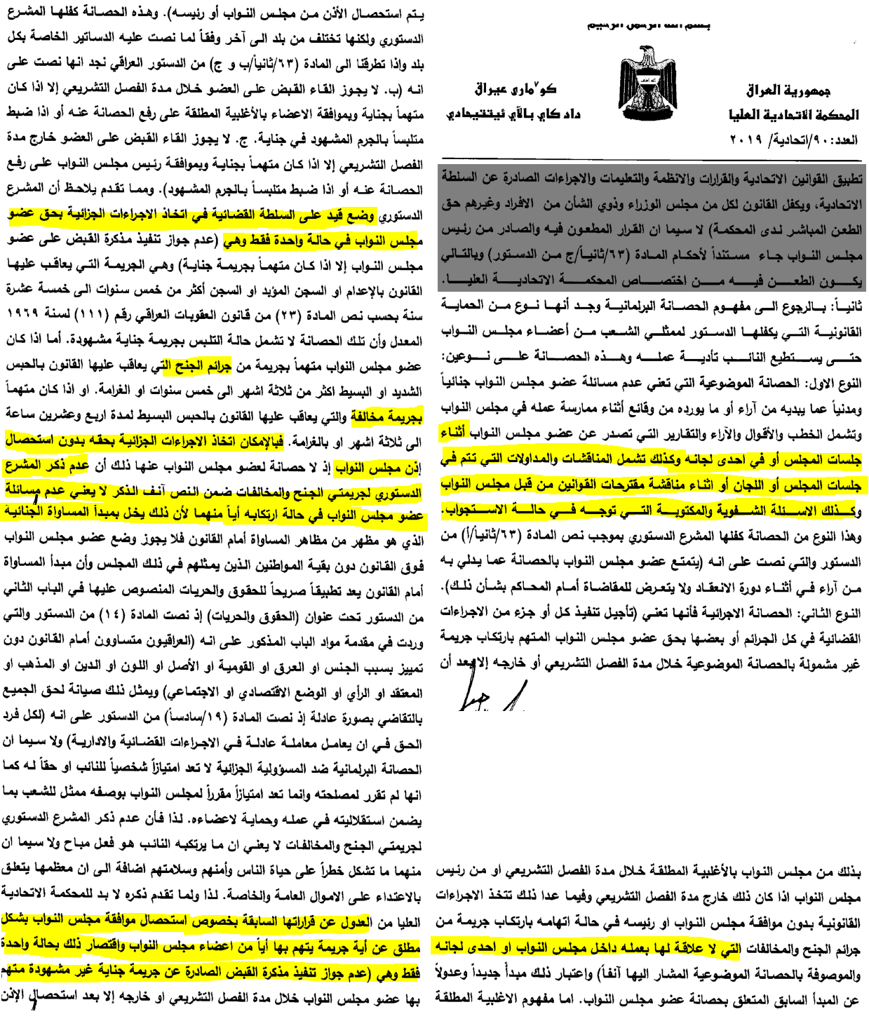 القرار الكامل للمحكمة الاتحادية بإنهاء عضوية رئيس مجلس النواب والنائب ليث الدليمي