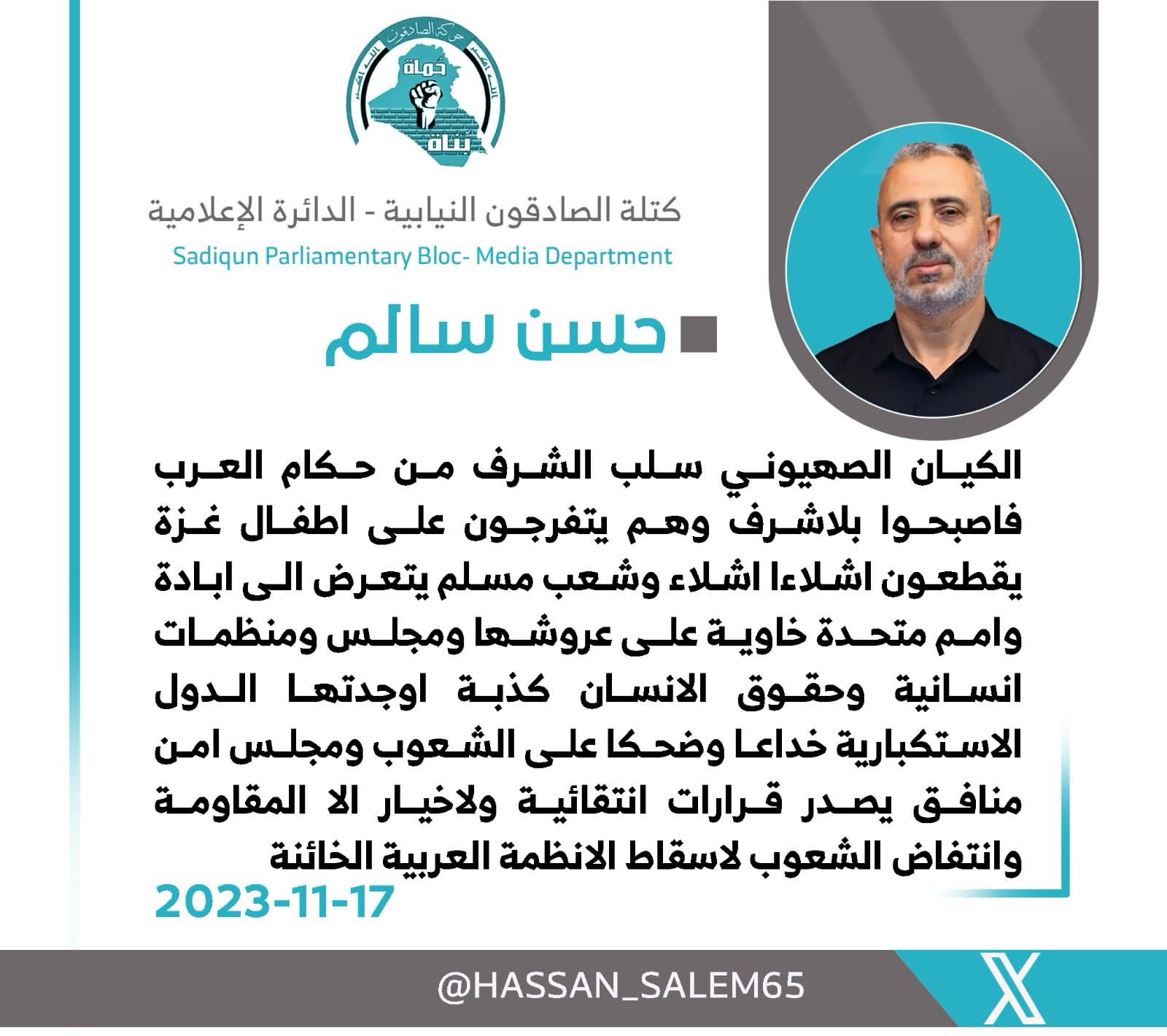 النائب حسن سالم يحيي فصائل المقاومة العراقية بعد ضرباتهم قواعد الشيطان الاكبر امريكا لنصرة الشعب الفلسطيني